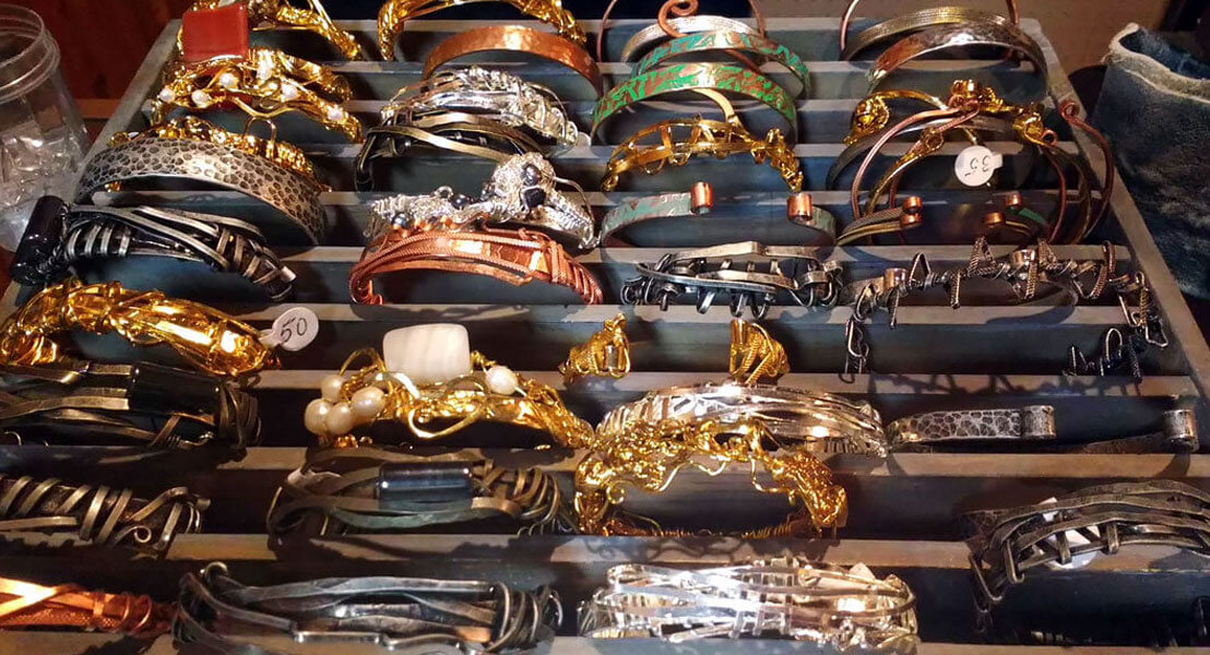 Bijoux en cuivre martelé, inox, accessoires en cuir, fleurs séchées intégrées avec pierres semi-précieuses et perles fines. Peintures acryliques et huile, paysages d’animaux et abstraits. Masques modelés en papier mâché et peints à la main.